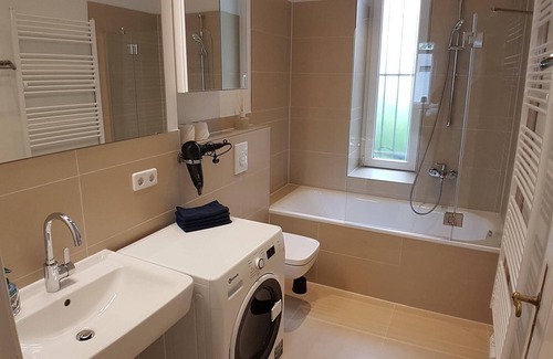 Newly renovated apartment with two bedrooms, fully equipped kitchen, high-quality bathroom, small terrace to the courtyard. You sleep in comfortable box spring beds, if necessary, sofa beds can be folded out and prepared, for the younger guests we provide baby beds and highchairs free of charge. A cozy get-together with a view of the beautiful courtyard of the house is possible in the kitchen. The popular old building flair is created by the wooden floorboards and the old apartment doors, in particular the imposing double door between the two bedrooms creates a noble atmosphere. In the newly renovated bathroom, in addition to the new elements including a bathtub, there is also a washing machine with a dryer function, practical for families.