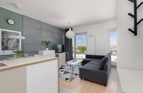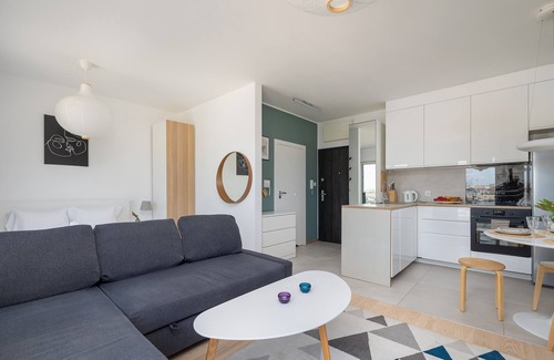 Langiewicza Deluxe Studio is a cozy and stylishly furnished apartment, featuring a living room with a sofa bed and a comfortable double bed, a kitchenette, and a bathroom. It offers a range of high-quality amenities, including free WiFi, terrestrial TV, a washing machine, an iron, a hairdryer, a dishwasher, an oven, a fridge with a freezer, and kitchen accessories.