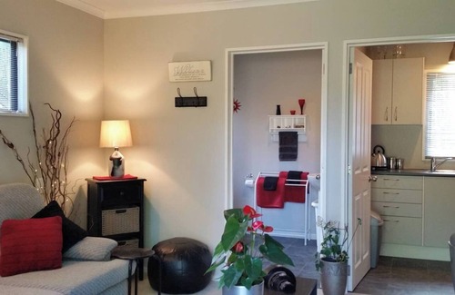 The apartment is situated at the far end of my home but with quite separate access and parking. It has a well appointed lounge, bedroom, kitchenette and bathroom. There is a small outside deck with table and chairs. While there is a washing machine in the kitchen for your own use, a communal clothes dryer is located in a separate semi-outdoor area close by. This is accessed along a path behind the apartment and may at times be shared by myself. Iron and ironing board available on request.