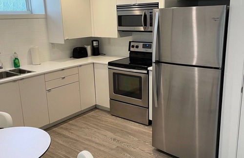 Located on a quiet street in North Vancouver. Spacious 950sq foot garden level suite with 2 bedrooms, full bathroom, full kitchen and washer/dryer. Level 2 EV charger with unlimited charging and/or carport parking available for $30 CAD/day. Lots of free street parking available if you don't need carport or EV charger. Wide street with plenty of room for large work trucks.