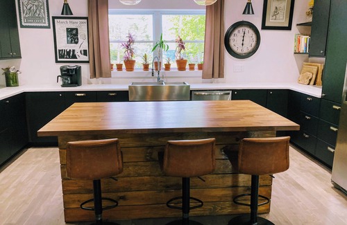 Once inside Humber Park Haven, you will find many high end modern amenities and so much space! The interior is 2400 square feet, in addition to the 12 x 36 deck on the back of the house. The main floor is mostly open concept, encompassing the kitchen, dining room, and two living areas (one with a pellet stove). Off of the open concept area, there is a half bath, a large entryway, a private office and a rec room. The rec room has a fold out sofa bed that sleeps two.