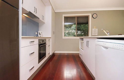 The kitchen/dining/ living room is open plan with air conditioning and ceiling fans for guest comfort and the living area offers a TV, DVD and CD player. The neat and tidy kitchen has a dishwasher, oven, cooktop, microwave, Espresso coffee maker and large fridge. The bathroom has a bath with separate shower and a separate toilet and the laundry offers a top loader washing machine and dryer. Plenty of off street parking.
