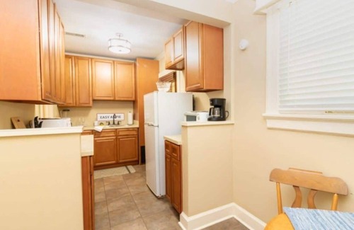 The main house has 5 bedrooms and 2 bathrooms. On the first floor, there are two living spaces and one has two full-size futons, a fully equipped kitchen, a full-sized washer and dryer, a formal dining room, three bedrooms (one with a king, two with a queen), and a full bathroom. Upstairs there are two bedrooms (one with two full beds and one with two twin beds) and another full bathroom. All linens and toiletries are included.