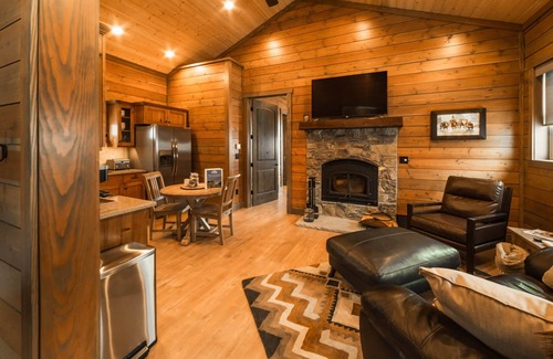 Each cabin boasts full kitchens, central heating and air, wood-burning fireplaces, and balconies with scenic views.