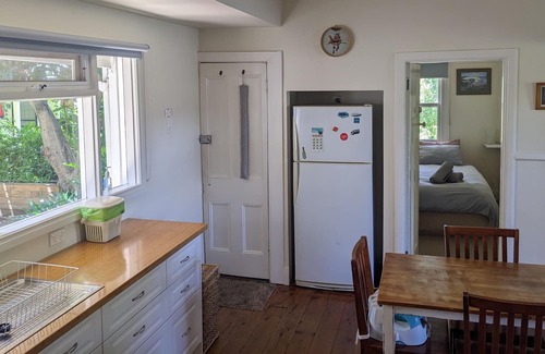 Historical renovated cottage with 2 bedrooms, full kitchen and bathroom and two one bedroom self contained studios complete with full bathrooms. Perfect for a family with older children, multiple young families, four couples, intimate events etc. There is a shed on the property which functions as a shared living space with a fireplace. There is also a shared outdoor dining area with a long table and chairs that seats 10. The block is 1400m2. There are many mature trees, native plants, edible plants and lawn areas on the property to explore and enjoy. Portacot and highchair available upon request. Pet friendly. Please note that the property is close to a train line and you can hear the trains.