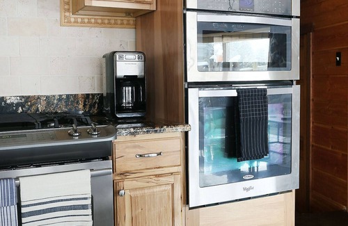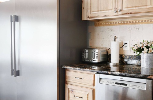 You'll enter the home through the large, open-plan kitchen. The fully equipped kitchen has a gas stove, oven, microwave, dishwasher, toaster, drip coffee maker, teakettle, and crock pot.