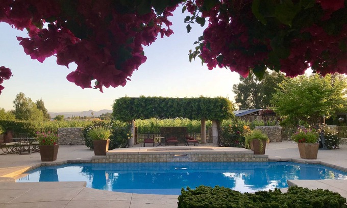 Step into the Italian lifestyle at Villa Riposo located on the ‘Wine Trail’ & delight in a romantic getaway. Enjoy your morning coffee next to the vineyard surrounded by beautiful flowers. Enjoy a glass of local wine as you watch the sunset with views of the mountains over the vineyard. Relax in the spa, enjoy a candlelight dinner in our rustic Room & top off the evening with S’mores by the fireplace. See my profile for more poolside suites & house rules for pets. Our Winery opens in 2026