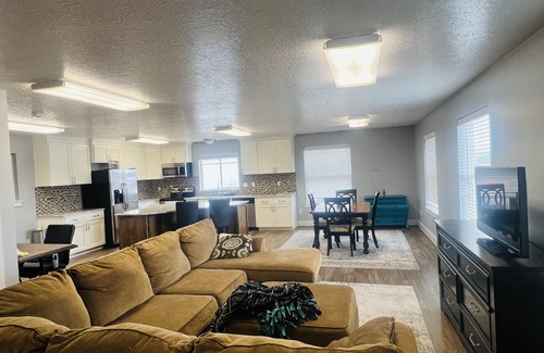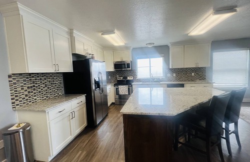 Huge kitchen, dining area, family (tv & sectional) area & king size bed, 3/4 bath, dresser, washer & dryer, spiral staircase access, carport parking, nice size deck, island plan for kitchen, lots of countertop & cabinet space, stocked kitchen w full size fridge. Quiet & private area, 5 miles from Utah State.