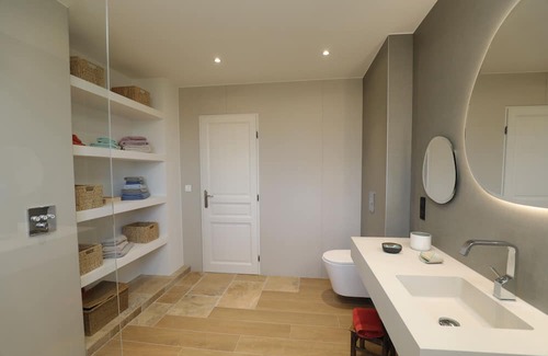 Concerning the day part, there is a bright living room equipped with a television with an access on the terrace. The kitchen is quite spacious with an adjoining laundry room, fully equipped (gas cooker 5 fires, oven, dishwasher ....). You have the possibility of taking your meals in the kitchen or on the terrace. This room also has direct access to the covered terrace overlooking the pool.