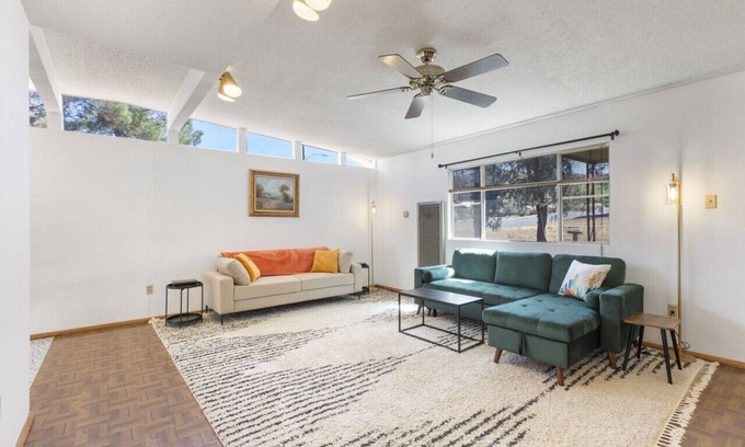 This charming mid century house offers a cozy and spacious base for anyone exploring the Big bend area. The 3 bedroom, 2 bath home has been maintained to exhibit many of its original features. Located near Sul Ross State University, Kokernot Park, and downtown Alpine. The primary bedroom is large with a king bed and sitting area. The ensuite bathroom has a separate soaking tub and shower. The other two rooms both offer queen beds and large closets. For larger groups, there is a sofa bed in the living room to provide an additional sleeping area if needed. The fully equipped kitchen is perfect for cooking meals with plenty of gathering space, including a small kitchen table, a larger dining table, and an outdoor bench under the covered porch. Las Hermanas is perfect for families or groups looking for a comfortable and convenient place to stay while exploring Alpine and the surrounding areas.