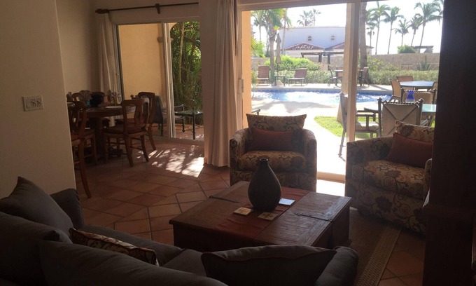 The lovely pool and ocean view patio have chairs for reading and a table for outdoor dining where ocean can be easily seen. Located in a very quiet area, the condo has a wonderful terrace overlooking a lovely garden, private pool and sparkling blue water views. Beautiful place to enjoy the Baja sun and watch the moon rise at dusk. Very peaceful and quiet--perfect place for a relaxing, fun-filled vacation! Direct walk-in/out access to entire property including vast white sand beach, 4 pools, hot tub, swim up bar and 3 poolside barbecue areas with high end commercial, immaculate BBQs always available for use (one about 50 steps from condo). Complete state-of-the-art, fully equipped gym, tennis courts and putting green all free for guests. Lots of free parking right outside condo.