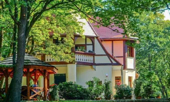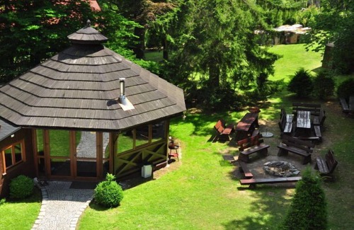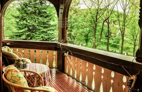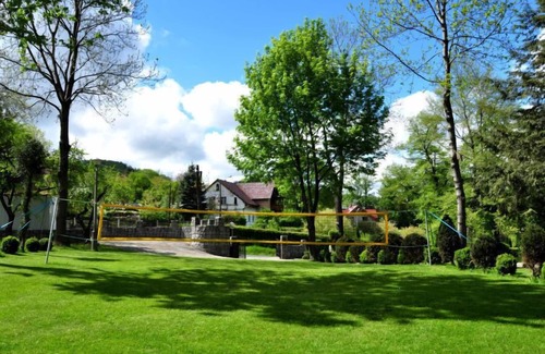 Zachełmie 20 km from Karpacz/Szklarska Por.: Comfortable manor house "Lawendowe Wzgórze", 2 storeys, built in 1930, renovated in 2008, surrounded by trees, meadows and fields. 650 m n.p.m. In a hamlet with 80 houses, 5 km from the centre of Jelenia Góra, in a quiet, sunny, elevated position, along the wooded area, 20 km from the skiing area, in the countryside. For shared use: property 8'000 m2 (fenced), beautiful, well-kept garden, swimming pool (above ground) (5 x 10 m, depth 130 cm, seasonal availability: 01.Jul. - 31.Aug.). Volleyball court, arbour, garden furniture, barbecue, fireplace, children's playground (swing, sandbox). In the house: sauna, relaxation room, spa area, central heating system. Motor access to the house (mountain road). In Winter: please take snow chains. Parking on the premises. Supermarket 5 km, shopping centre 12 km, restaurant 1.5 km, bus stop 60 m, railway station "Jelenia Góra Sobieszów" 6 km, indoor swimming pool 6 km. Tennis 1.5 km, riding stable 50 m, cable car 20 km, mountain railway 20 km, ski lift 1.5 km, skisport facilities 1.5 km, slopes 1.5 km, ski school 1.5 km, children's ski school 1.5 km, sled run 20 km, ice rink 6 km. Please note: suitable for families. The owner has a total of 12 extra beds (each additionally paid on site for PLN 80/day), so the maximum number of people that can be accommodated is: 24 people + 2 babies.