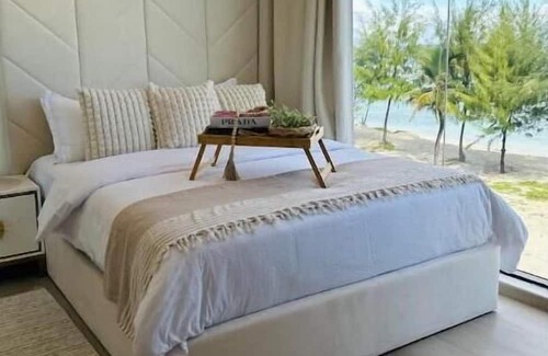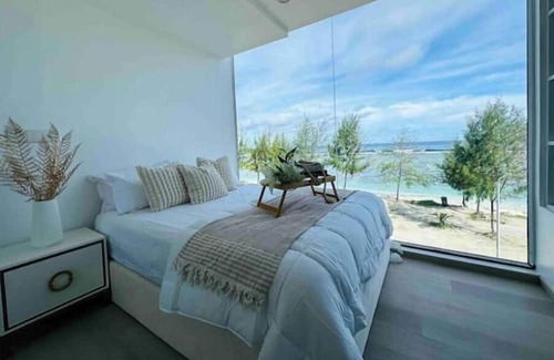 Large, perfectly working kitchen set. A seating area where guests can unwind and watch television. A balcony with a breathtaking panorama. You can enjoy a breathtaking view of the beach and ocean while you're laying down on the master bedroom bed. And enjoy a mesmerizing sunrise while laying down on the comfy bed. Our property is directly across from the beach and the ocean.