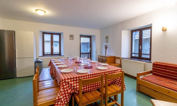 Communal apartments in a house with 2 other accommodations. Ground floor: living room-kitchen with 1 trundle bed 140x190 cm, 4 bedrooms including one with shower room (1 double bed 140x190 and 1 single bunk bed 90x190 cm / 1 double bed 140x190 and 1 single bunk bed 90x190 cm / 1 double bed 140x190 and 1 single bunk bed 90x190 cm / 1 double bed 140x190 and 1 single bunk bed 90x190 cm), shower room. Shared laundry room in the basement. Spacious apartment with good comfort that can accommodate up to 13 people. Simple and functional, it is practical with essential equipment. Ideal for a group looking to get together.