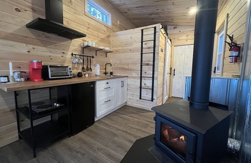 Cozy tiny house with a view on the river. Perfect getaway to relax and diconnect in the nature. 5 min. from all amenities. Queen bed in the window and double bed up the ladder, full bathroom, Wood stove and AC.