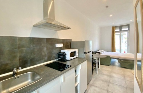 An optimized and comfortable space: As soon as you arrive, you will be seduced by the practical and elegant layout of the studio. The living space cleverly combines a sleeping area with a comfortable sofa bed (140x190), perfect for a restful rest, as well as an office area for working or relaxing and a small balcony area for your breakfasts with a dining table. bar and its two chairs.