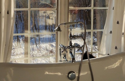 The bathroom is located in the main house. It has a separate access and is exclusive to the guests for the duration of their stay. There is a rolltop bath with a European shower fixture with beautiful views to the forest. Tell us your taste in music and we will be happy to supply the sound track to a soothing bubble bath:)