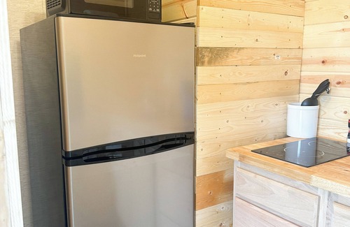 In between the two bedrooms, there’s a shared kitchenette with a fridge, microwave, coffee maker, and some basics for easy meals or snacks.