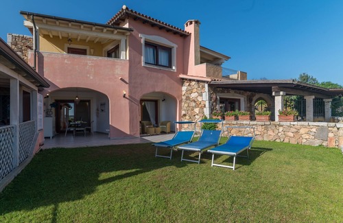 "Lentischio", 3-room apartment 95 m2, on the ground floor. Tasteful and cosy furnishings: living/dining room with 1 sofabed, satellite TV and air conditioning. Exit to the terrace. 1 double bedroom with shower/bidet/WC. 1 room with 1 bed and 1 x 2 bunk beds. Kitchen (oven, dishwasher, 4 gas rings, microwave). Shower/bidet/WC. Electric heating, air-conditioning (extra). Terrace 30 m2 partly roofed, garden 75 m2, lawn. Terrace furniture, deck chairs (2). Marvellous view of the sea. Facilities: washing machine, iron, children's high chair, baby cot (extra), hair dryer. Parking (roofed). Maximum 1 pet/ dog allowed. IT090083B4000E2141