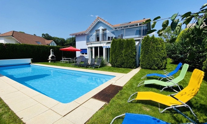 12 m long heated outdoor pool - outdoor whirlpool - fitness area - infrared sauna with light therapy - 3 furnished terraces - large green garden outside the villa - barbecue - toys for the little ones - Netflix in the living room - very quite area with nice hiking trails. Therefore, guests can fully relax in the villa or be active in sports, as desired. Beautiful nature surrounding the house with several hiking trails complete the experience.