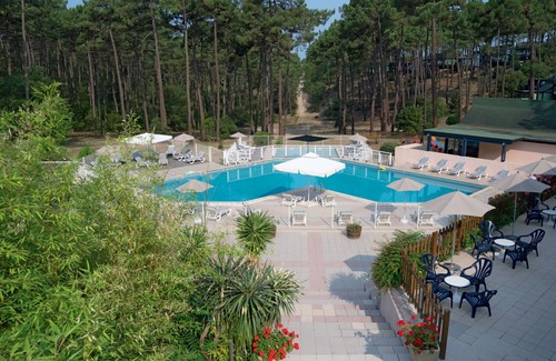 Maubuisson 5 km from Carcans-Plage: Simple holiday village "Les Cavales". 2.5 km from the centre of Maubuisson, 5 km from the centre of Carcans-Plage, 14 km from the centre of Lacanau-Océan, in a quiet position, 5.5 km from the sea, 2.5 km from the lake, 2.5 km from the beach, in the woods. For shared use: swimming pool fenced (240 m2, seasonal availability: 01.Jul. - 31.Aug.). WC in the pool area, children's pool, outdoor shower, table tennis, boccia, volleyball court, children's playground. In the complex: reception, washing machine, tumble dryer (for shared use, extra). Parking. Shop 2.5 km, supermarket 11 km, restaurant 2.5 km, sandy beach "Carcans-Plage" 5.5 km, bathing lake "Maubuisson" 2.5 km. Golf course (18 hole) 15 km, surf school 5.5 km, sailing school 2 km, walking paths from the house 10 m, cycle lane 200 m. Nearby attractions: Pauillac (route des vins) 40 km, Bordeaux 60 km, Soulac / Cap-Ferret 70 km, Royan (par le bac) 80 km. Please note: car-free holiday complex. Loading and unloading of baggage is possible at the holiday house. The photograph shows a typical example.