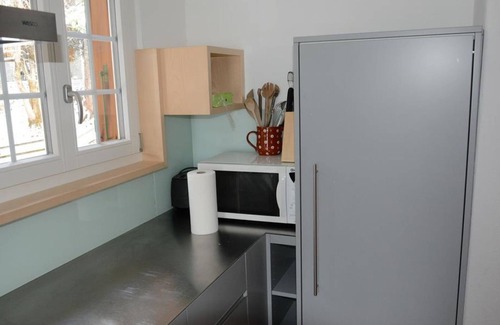 Cosy wooden chalet on three floors. Ground floor: Playroom with table tennis, washing machine and tumble dryer. 1st floor: Dining and living room with salon table, radio, TV, balcony. Older kitchen among other things furnished with microwave oven, dishwasher, refrigerator with freezer, fully automatic coffee machine, fondue- as well as a raclette-set and a pass-through to the dininig room. 1 small bedroom with double bed (2x90x200cm). Bathroom and toilet. 2nd floor: 1 bedroom with a single bed (90x200cm) and washbasin. 2 bedrooms with a double bed (2x90x200cm), washbasin and balcony. Bathroom with shower and toilet. WiFi.
