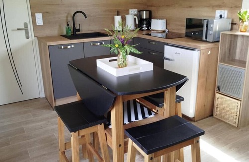 Fully equipped kitchen: Refrigerator, toaster, kettle, filter coffee maker, microwave, and dishwasher, Airfryer (pas de four traditionnel).