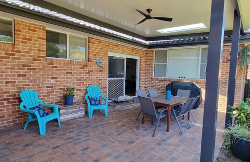 Liandys is a recently renovated air conditioned home with a modern interior and light filled rooms. 3 bedrooms - 2 x QB and 2 x King Singles (which can be easily pushed together to create a KB), DB sofa bed in Living Room. Huge bathrooms with an extra washroom in the large laundry area, which is also a lockable storage area for your water toys. Beautiful gardens and front deck to enjoy the regular visits from the local kangaroos, parrots and some resident bower birds under the frangipanis.