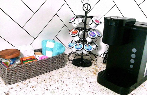 -- Coffee Bar: Keurig coffee maker with complimentary coffee pods, tea, hot cocoa, creamer, and sugar.