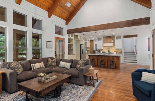 The vaulted ceilings and wood floors throughout the property add a touch of elegance and create a warm and inviting ambiance. The living room is spacious and open, perfect for entertaining guests, and features eight flat-screen TVs for guests' entertainment and convenience.