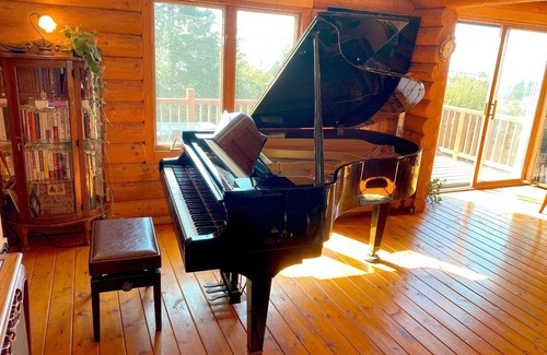 Living room with a partial atrium grand piano genuine leather sofa audio table games 49inch 4K TV massage chair kitchen cooking utensils tableware hot plates etc washroom Toilet Bathroom Bedroom 1 3 futons Bedroom 2 2 futons Loft 2 futons