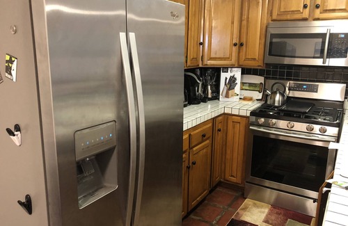 • a kitchen with new appliances (oven, dishwasher, microwave), a coffee maker, microwave, blender, toaster, waffle maker. The kitchen is fully stocked with cooking utensils;