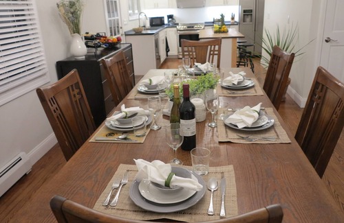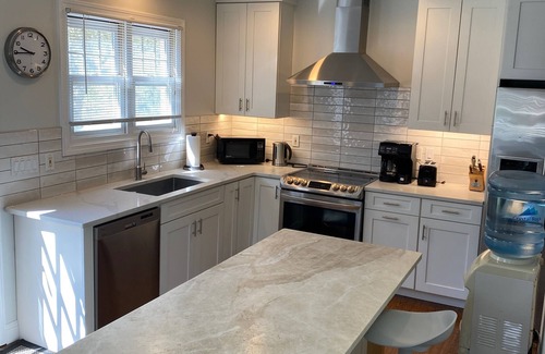 The house has a fully equipped kitchen with all new cabinets, stainless steel appliances, and a formal dining room. It also has a large living room with built in bookshelves, and a wood-burning fireplace. Large master bedroom with bath and the additional 2 full bedrooms (along with the second full bathroom) make this house comfortable for six, but can accommodate up to eight. Outside stands a 2-door garage, which can hold 2 cars with automatic closing doors, and a blue stone patio with a beautiful grill for you to use.