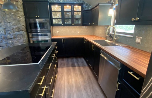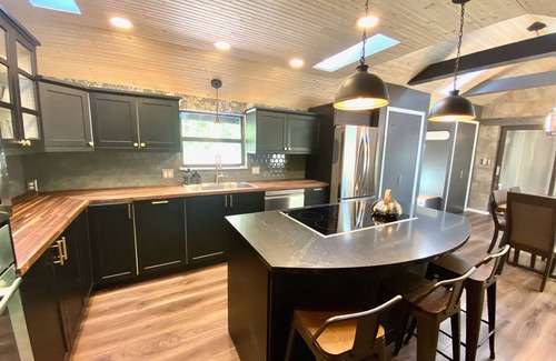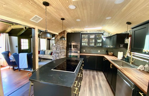 Adjacent to the rustic living room you’ll find the large newly renovated kitchen and dining area. The sleek kitchen provides all the luxuries of modern living including a 36” induction cooktop, wall oven, built in microwave, dishwasher, and plenty of counter space . The kitchen is fully stocked with a large selection of pots, pans, cooking utensils and kitchen gadgets so you can comfortably enjoy your meals. In the morning you can wake up with a variety of options at the coffee bar including drip, French press and Keurig.