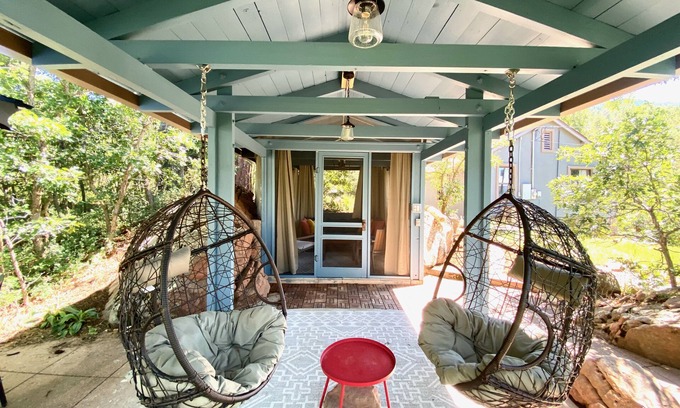 There are 2 cozy bedrooms in the back of the cabin that can be completely closed off from the rest of the space so that guests can sleep-in without being bothered by any noise in the living area. Both bedrooms feature a view to the cliffside, and any wildlife that might cross the yard. One bedroom has a queen bed with large flat screen tv, and the second bedroom features a full size bed. Just down the hall is the the main bathroom with floor to ceiling slate tile and a spacious shower with rain shower head.