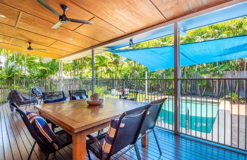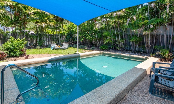 A large pool is the perfect centrepiece of Butterfly Bungalow with a shade sail allowing comfortable swimming all summer long.
