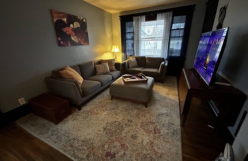 Buffalo is waiting for you at this 1-bedroom house. Step inside this marvelous property and be greeted by a cozy atmosphere that will make you feel right at home. The gorgeous bedroom features a comfortable queen bed, ensuring a restful night's sleep for our guests. With amenities like WiFi and heating, you'll have everything you need for a superb stay. Take a relaxing soak in the bathtub in the pristine bathroom. Whether you're exploring the city or simply enjoying some downtime, it's easy to see why you'll be able to unwind at our place. Frankie has been newly renovated, fully furnished two-bedroom apartment conveniently located close to the city. This modern abode features a spacious living room, a cozy dining area, and a fully equipped kitchen ready for culinary adventures. Additionally, indulge in the luxury of a separate dressing room, adding convenience and elegance to your daily routine.