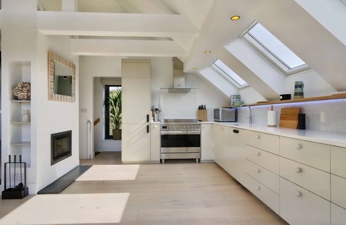 Well-equipped kitchen with quartz worktops and upstands, range cooker, wine fridge, Quooker hot water tap, dishwasher, Nespresso coffee machine (larger sized Verto capsules) and microwave. Wide bifold doors lead to the upper decked area.