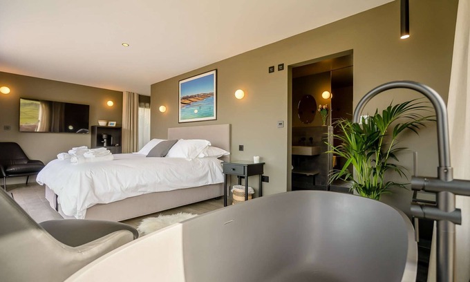 Master Bedroom (sleeps 2) king size bed, 6 metre wide triple sliding doors lead to large patio and gardens beyond. En-suite shower room with double sink and WC, wonderful freestanding bath in the bedroom. Smart TV, Nespresso coffee machine.