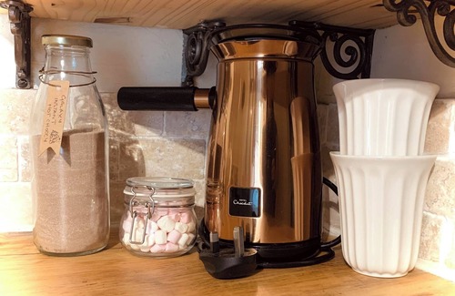 The lounge at the heart of the cottage just oozes cosiness. Cream and green accents give it a country vibe. The painted fireplace (modern electric heater with realistic flame light) and unique handcrafted soft furnishings just completely say Rural chic. The pitched pine and beam ceiling is low (over five foot eight and you will need to duck!) but it really adds to the charm of the place. You get a smart TV which is fantastic for Netflix bingeing if outside is doing its worst. A 2 person squishy sofa, equally ample squishy armchair and matching large wool covered ottoman give you the sitting down ahhhh factor. A small waney wood shelf under the stairs and bar stool, a small handmade wooden bistro table, 2 wooden chairs on local slate floor with a generous rug completes the room set up. There are stairs to the bedroom (10 steps). There is a KINGSIZE bed (separate duvets available by request), chest of drawers & wardrobe space to hang your clothes, with green accents for calmness. Each room has a thermostatically controlled Fischer heating system which you control as you require.