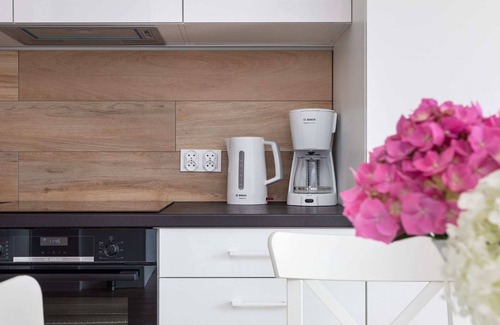 The charming apartment is located on the 2nd floor and can accommodate up to 4 people, making it a great choice any type of seaside holidays. The 34 m² surface is divided into a living room with a double sofa bed, a kitchenette, a bedroom with a double bed, and a bathroom with a shower. The living room has access to a balcony fitted with garden furniture, on which guests can enjoy warm summer evenings or a morning cup of coffee. The apartment has an elegant decor with original details, and is functionally arranged. The comfortable sofa is the perfect place to relax by the TV, and at the table with chairs you can comfortably eat meals in pleasant company. The amenities include a flat-screen TV and a fully-equipped bathroom and kitchen (including, but not limited to, a washing machine, a dishwasher, and ironing facilities). For an easy beginning of every stay, complimentary cosmetics set, towels, and bed linen are provided.