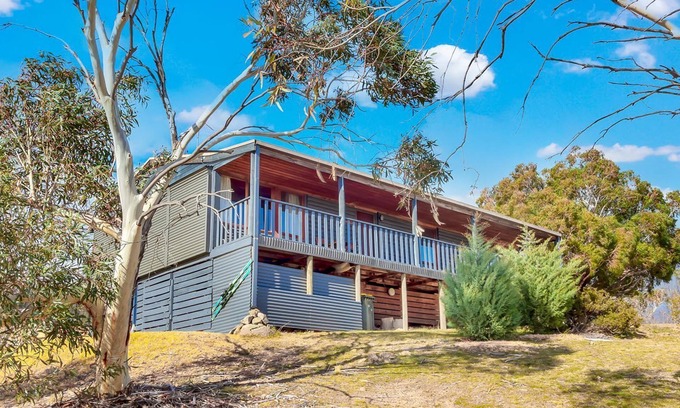 A veranda extends the length of the property, offering views of the mountains and Lake Jindabyne. A spacious backyard allows kids room to run around and play.