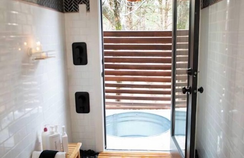 A fully glass door opens from the indoor shower of the romantic treehouse cabin to an enclosed outdoor deck featuring a 4' round trough tub and a second rain shower head with on-demand hot water. Enjoy both the fresh country air and privacy with adjustable louvres.