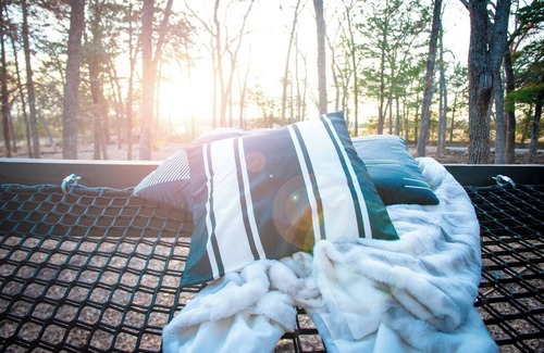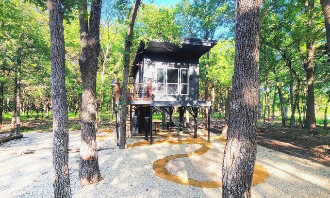 This luxury treehouse cabin, nestled in 5 acres of wooded countryside, is a perfect retreat to relax, rejuvenate, and refresh, and is located 1.5 hours east of Dallas between two lakes. Whether you're relaxing in the beautiful king sized bed cubby, lounging 8' above the forest floor surrounded by pillows and blankets on a massive 6' x 12' netted hammock deck, or taking a bath or rain shower on the semi-enclosed tub deck, this romantic treehouse is where luxury and comfort meet fun and fantasy.