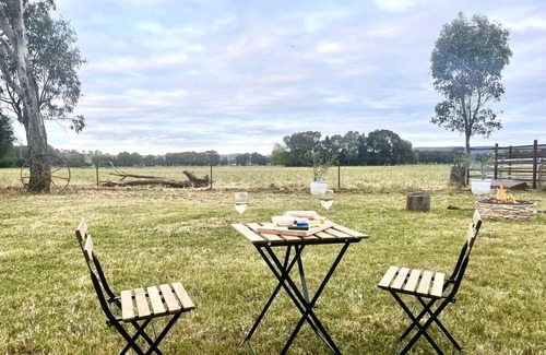 Little Mango Farm Retreat by Tiny Away sits in the small town of Mangoplah, 36 kilometres south of Wagga Wagga in the Riverina region. This countryside getaway is nestled on a flat piece of land with an outdoor firepit for BBQ nights and uninterrupted views of pastures, hills, and stars.