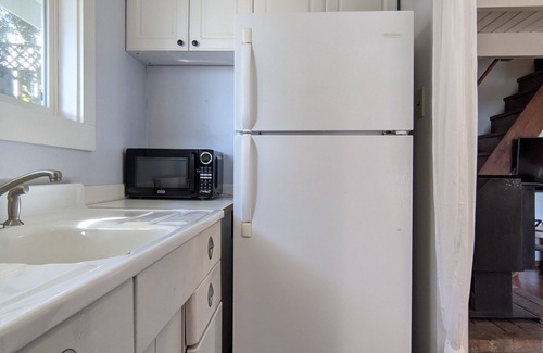 The kitchenette is fully stocked to prepare meals with a 20" stove and full size fridge/freezer, sink, and microwave. Coffee can be made with the Chemex pour over or traditional coffee maker.