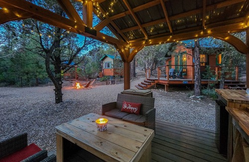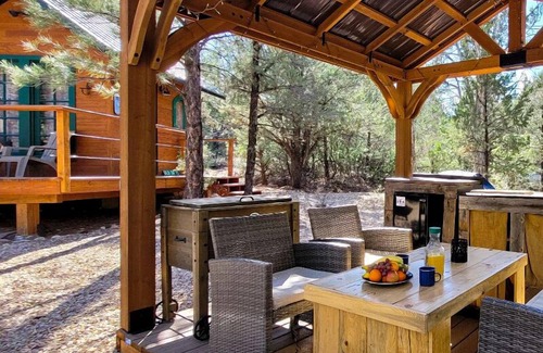 Discover the perfect escape at our unique and charming cabin, nestled among Ponderosa, Juniper, Pinion Pine trees, Manzanita evergreen, Scrub oak, and sage. Experience glamping at its finest in this tranquil oasis. The cabin offers a private outdoor kitchen area, a shower house, a propane grill, and a cozy fire pit, creating the ultimate outdoor experience.