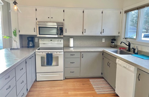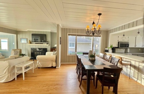 Set right on the Miracle Mile of East Bay, this home has it all! Plenty of space with 4 bedrooms and 3 full bathrooms, updated flooring and appliances; this home sleeps 8-10. Classic cottage shiplap decorates this bayside home with 75 feet of frontage on East Bay. The patio is steps from Grand Traverse Bay on the prettiest stretch of beach in Traverse City