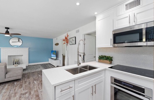 The house has two bedrooms with queen-sized beds and a Jack and Jill style bathroom. The kitchen, living, and dining areas combine for a bright, open floor plan. The stunning kitchen has quartz countertops, stainless steel appliances including an induction stovetop, and bar seating. The covered patio is furnished to enjoy the South Florida weather. This house has everything from bamboo sheets, bath and beach towels, and new furnishings to a fully stocked kitchen, games, and bicycles.