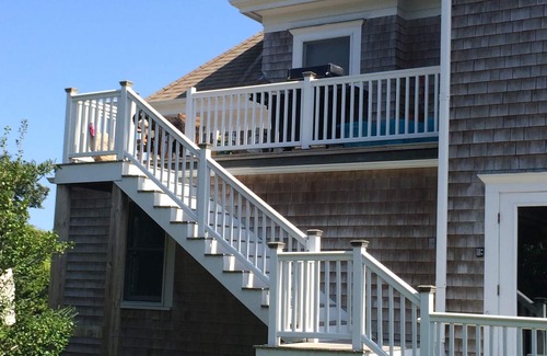 Pet Friendly! Two bedroom luxury vacation condo on second floor of home in the heart of Chatham Village! Head up the stairs to find a lovely deck with cafe table and gas grill. Open the door to your little piece of heaven: the open floor plan boasts a gourmet kitchen, including a breakfast bar for 2 and a table that seats 4, skylights, living area with flat screen TV, DVD, high-speed internet access, and central air. There are 2 master suites: one on each side of the living area-offering privacy to the occupants. Both offer bathrooms with showers. The first suite has a King size bed and the larger 2nd suite has 2 Queen size beds. Walk to Chatham village and the local beaches: Andrew Hardings, Lighthouse and Claflin Landing! Kayak or canoe in Mill pond-just a couple blocks from the condo. 2 parking spaces available.